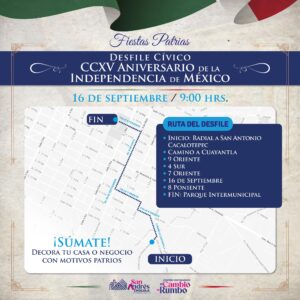 Con respecto al desfile cívico del 16 de septiembre, se informa que los contingentes iniciarán su recorrido a las 09:00 horas partiendo desde la Radial a San Antonio Cacalotepec. Posteriormente: