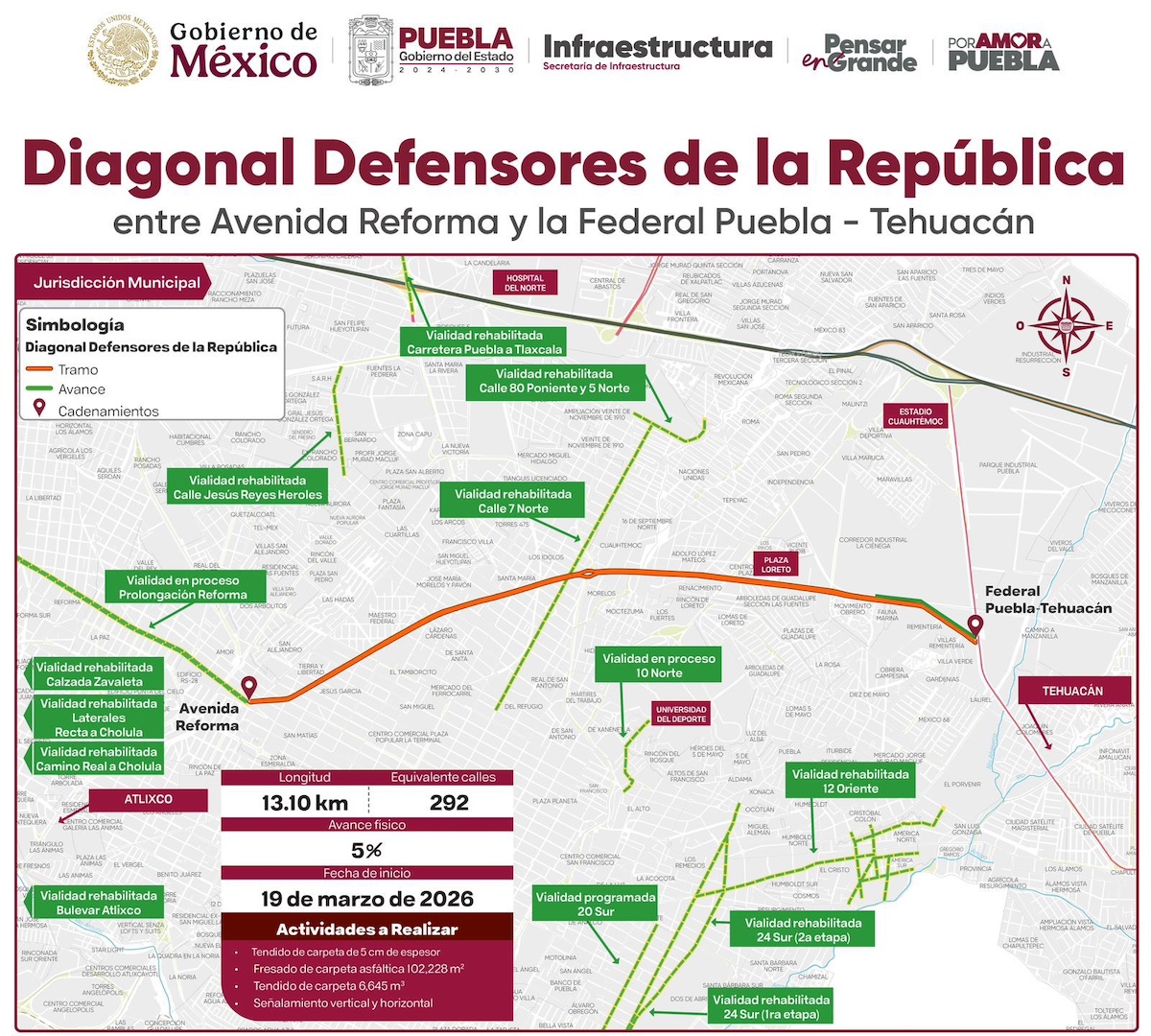 El Gobierno del Estado de Puebla avanza en la rehabilitación de la diagonal defensores de la república, una de las vialidades más importantes de la capital, con una meta de 13.10 kilómetros de pavimentación asfáltica. Esta obra busca mejorar la movilidad urbana, reducir riesgos viales y atender el deterioro acumulado durante décadas.