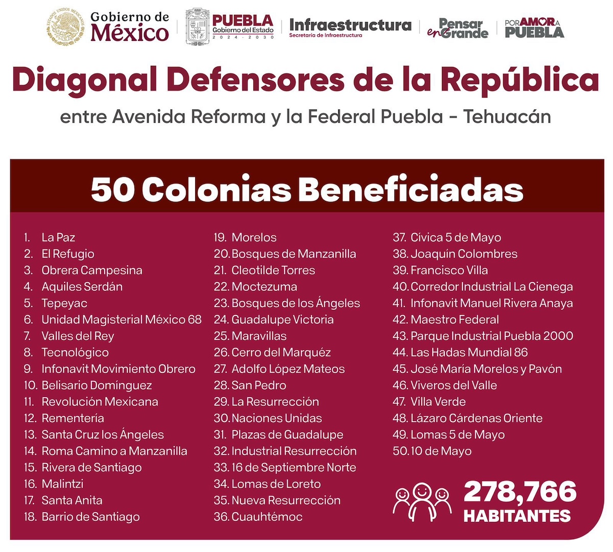 La intervención beneficiará directamente a más de 278 mil habitantes de al menos 50 colonias, entre ellas La Paz, El Refugio, Aquiles Serdán, Bosques de Manzanilla, Lomas de Loreto y Parque Industrial Puebla 2000. Esta vialidad representa un eje clave que conecta distintas zonas de la ciudad y facilita el tránsito hacia otras regiones del estado.